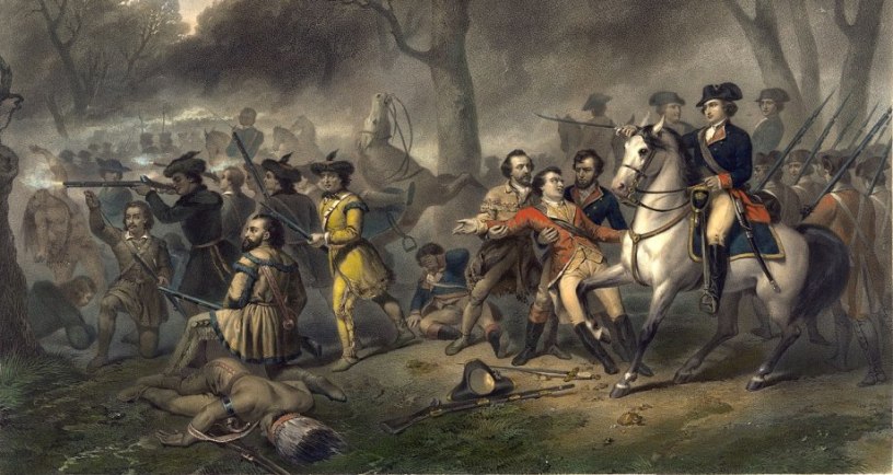 As the situation spun out of control, Washington begged Braddock to allow his men to take cover and save themselves from the slaughter. Braddock emphatically refused, and he himself stayed in the hottest part of the action to set an example. Both he and Washington had multiple horses shot out from underneath them, but kept getting back into the saddle. Meanwhile, the general’s other two aides were shot down. Now the “sick pup” was his sole support. But the feeling between the two was none-too-amicable as the casualties mounted and the folly of Braddock’s stubbornness became increasingly apparent. Still the general rode through the thick of the battle with bullet whizzing around him, flashing his sword and trying to steady his men, while at the same time slashing down any who dared to run. Washington continued to plead with him to change his orders, but the general only swore at him and mocked him as a “beardless boy.”