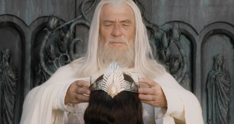Returning victorious, Aragorn proceeds to the city to be crowned King. He does not seize power but receives the crown, the symbol of his authority to rule, from Gandalf the Wizard, the representative of a higher authority (who in turn are ultimately the representatives of the Highest Authority). As King, Aragorn has authority over all the men of the West, yet he himself is subject to the just law.
