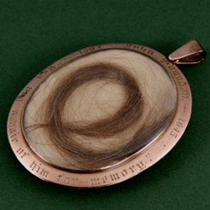 In addition to Hampden’s name and dates, the rim of the locket containing the lock of hair is elegantly engraved with this little quotation from Shakespeare’s “Julius Caesar,” from Marc Antony’s Funeral Oration: “Yea, beg a hair of him for memory.”