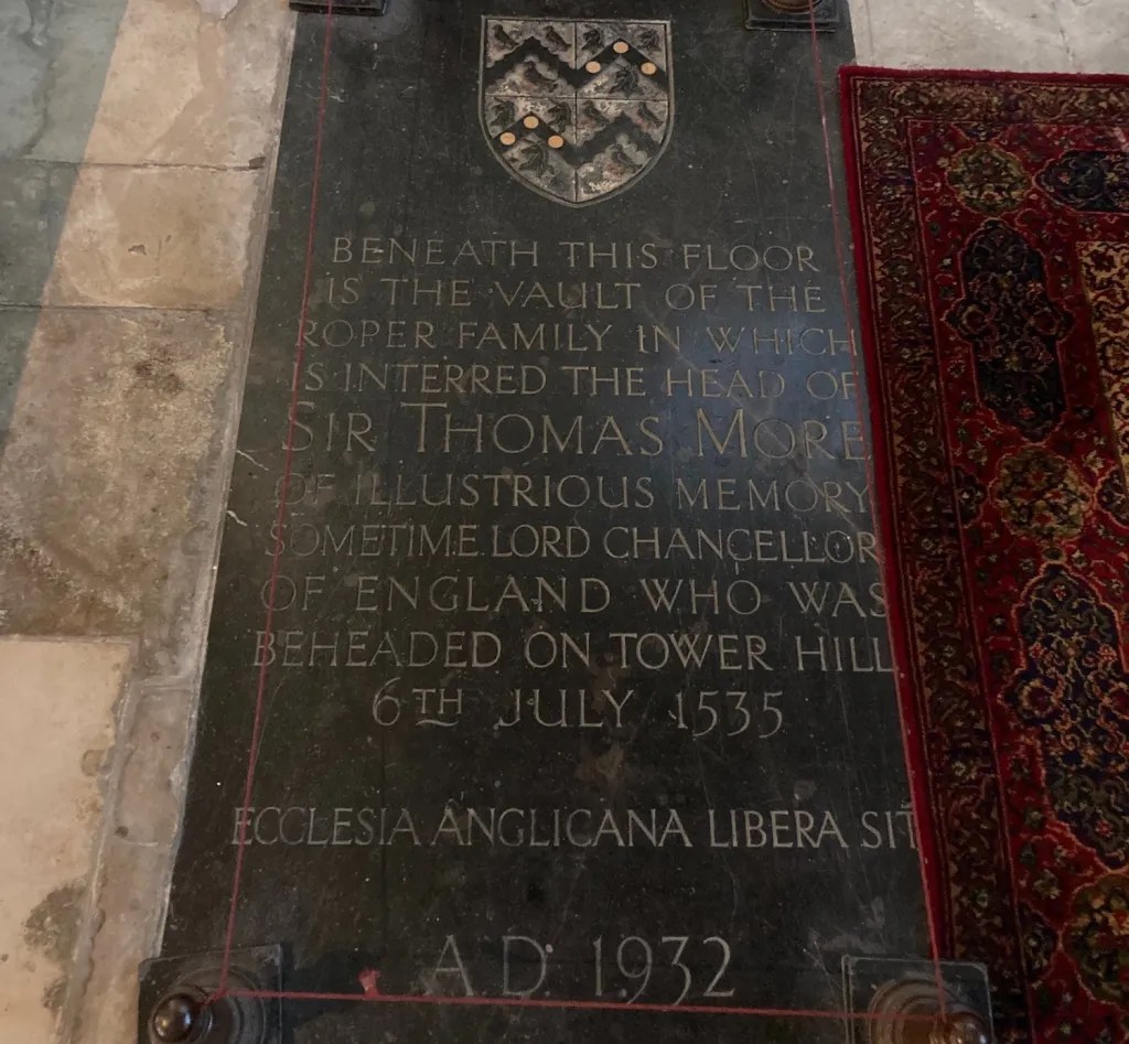 If it is indeed More’s head, there is the curiosity that one of the family thought it appropriate to bury him in a church which was, by the date his head arrived, committed to the Elizabethan settlement which he would have reviled, even if it is in a private family chapel. Whatever happened to his head, Saint Thomas More remains a shining example of fidelity and courage, standing almost alone against the actions of an evil tyrant much as his namesake Thomas Becket had done in 1170. But every year on 6 July, the date of St Thomas More’s execution, St Dunstan’s church holds a commemorative civic service, which is attended by the Lord Mayor, local Catholic clergy and members of the legal profession, with an address by a scholar, lawyer or public figure. All agree that they can unite behind, and cherish, the memory of St Thomas More, a man of courage and integrity.
